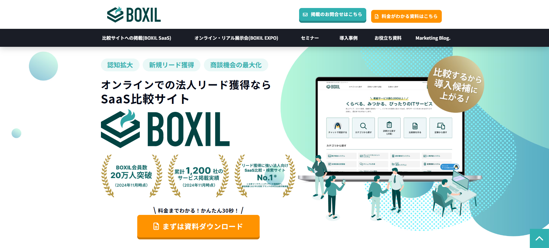 BtoBのマッチングプラットフォームサービスを提供するボクシルのサイトはトップページでは「お問合せ」はサイトの雰囲気に合った緑色、「資料ダウンロード」はオレンジ色のボタンになっています。「資料ダウンロード」は他の要素とは違うように目立たせており、このサイトで特に誘導したいアクションは資料ダウンロードであることが分かります。