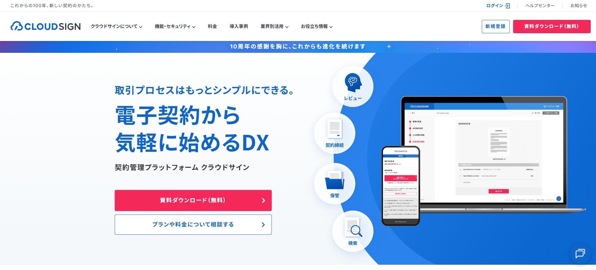 同様に、電子契約サービスのクラウドサインのサイトでも、トップページのファーストビューに無料アカウント登録のフォームが設置されています。