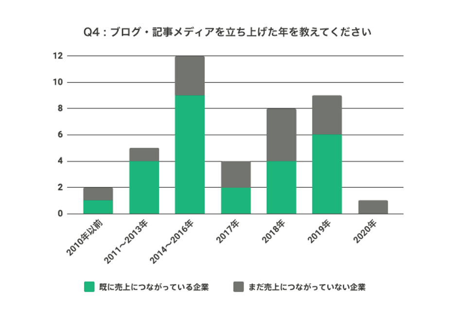 ブログ・記事メディアを立ち上げた年について調査した結果が下のグラフだ。