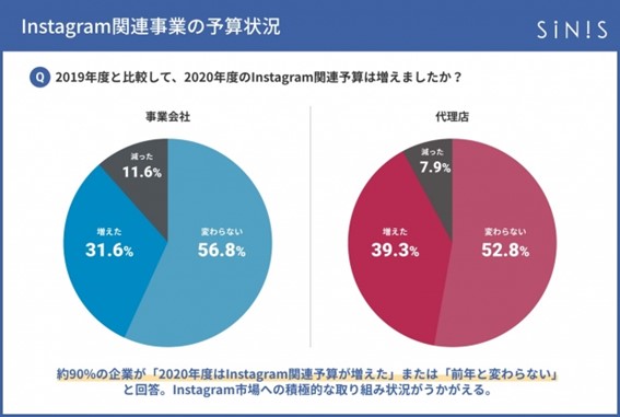 さまざまな業界の企業が広告活動に活用しているInstagram。取り組む企業は増え、2018年以降、急成長を遂げたことが見て取れる。2020年の「Instagramに関連する予算」においても、90%近い企業が「変わらない」または「増えた」と回答したようだ。自社がマーケティング活動を進める上で、Instagramの必要性を感じているからだろう。積極的に取り組む意思が感じられる結果となった。