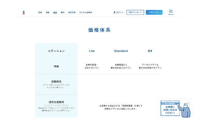 法人向けクラウド名刺管理サービス「Sansan」のサイトにある費用ページは、「価格体系」という形で請求書発行プラットフォームの費用に関する情報が掲載されています。