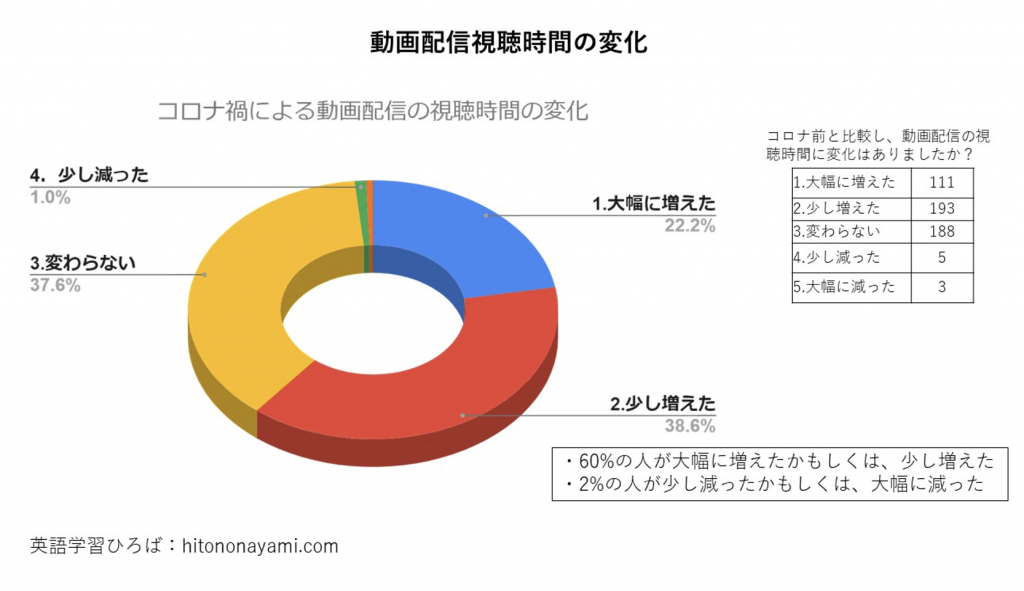 視聴時間が減った人の合計は約2%だったことから、多くの人の視聴時間が増加しているといえるだろう。