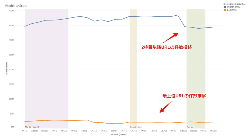 大規模サイト運営者にとってはヒヤリとする動きですが、減少が発生したのは2件目以降の表示URLに対してであり、最上位表示URLはほぼ影響を受けていません。したがって、クリックへの影響は軽微なものと捉えています。