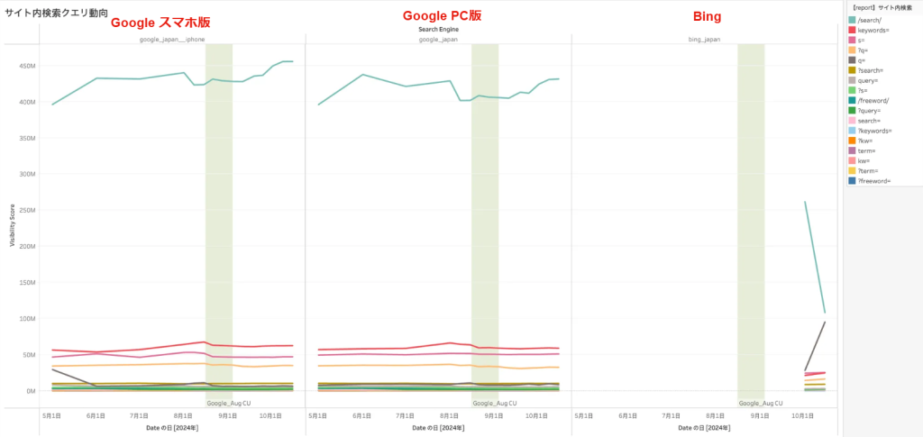 直近の色付き帯の期間は8月のコアアップデート(以下、CU)を示しています。8月CUは小幅であったという見方もありますが、このようにトレンドで見ますとやはりCUでは動きがあったんだなぁと思わせる動向です。