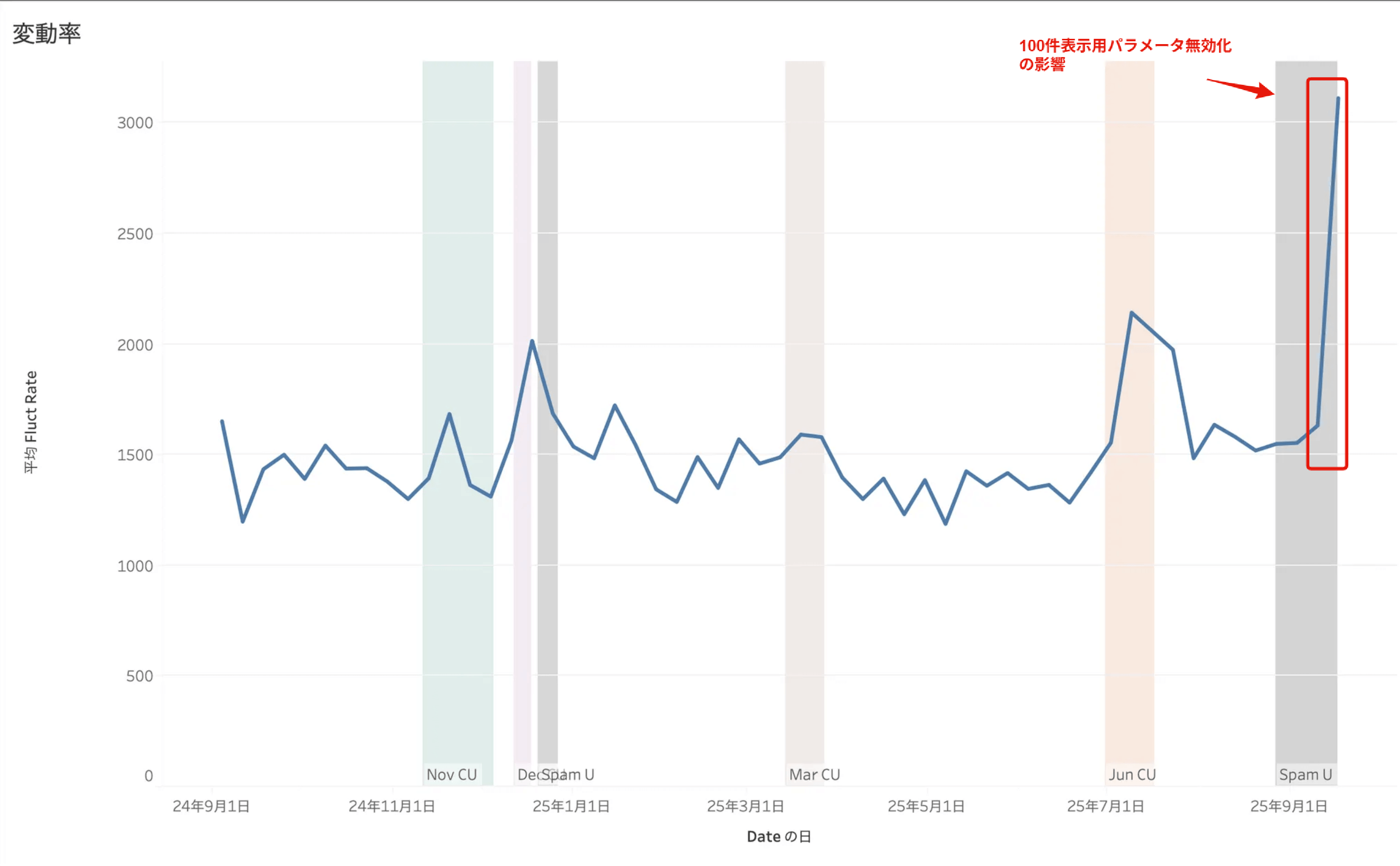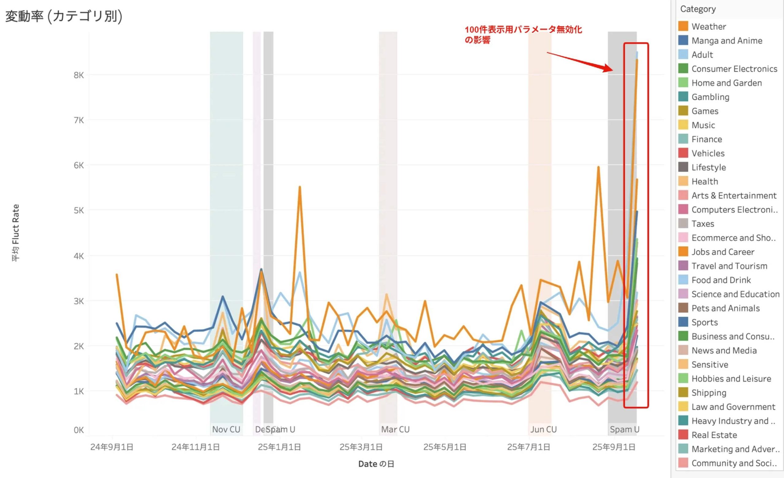 直近の大きな変動は、さきほどお伝えした100件表示パラメータ無効化の影響です。実態の順位変動とは別モノですが、今回の仕様変更が与えるインパクトは感じていただけると思います。