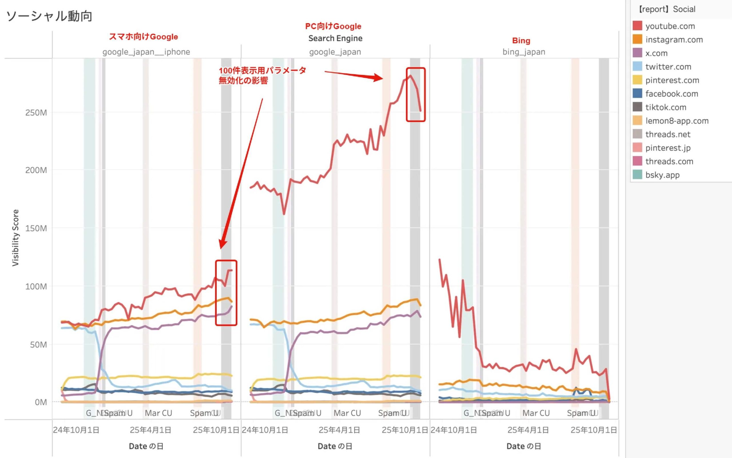 パラメータ無効化の影響を受けて、分かりづらくなってはおりますが、YouTube(赤)が優勢なのは変わっておりませんね。少し前にGooglebot(編注:Googleのウェブサイトクローラー)に対するインデックス開放を宣言したInstagram(オレンジ)はもう少し劇的に伸長するのかと思いきや地味ですね……もう少し派手な動きを期待はしておりました。