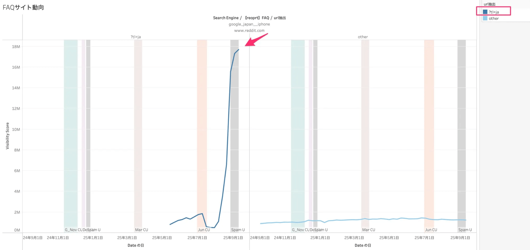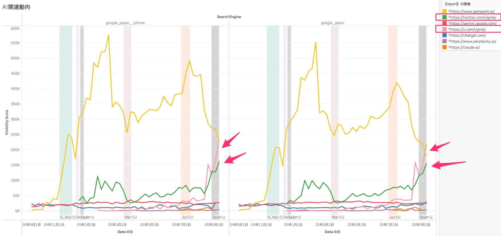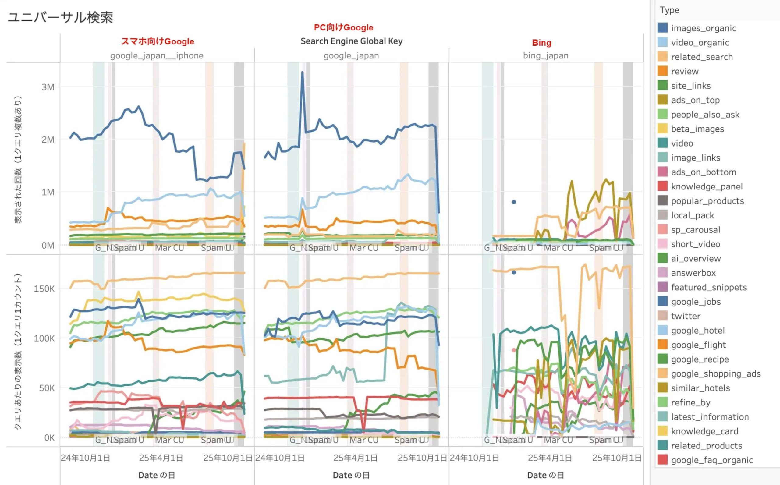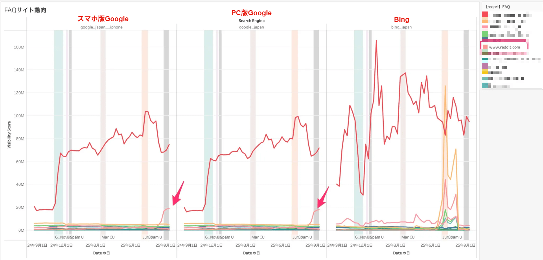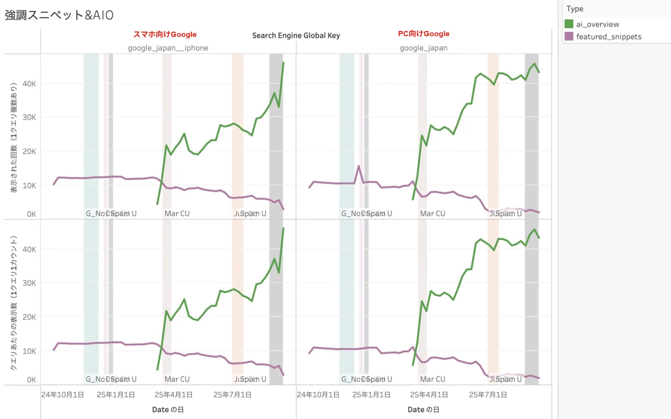 グラフの中で、色付きの帯表示の期間がGoogleによるアップデート期間を示しています。