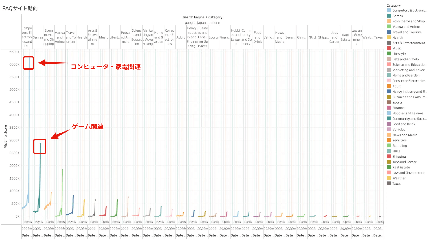 どの検索クエリで露出が上がっているかについて調べたところ特に「コンピュータ・家電」「ゲーム」関連のクエリでの上昇が顕著です。