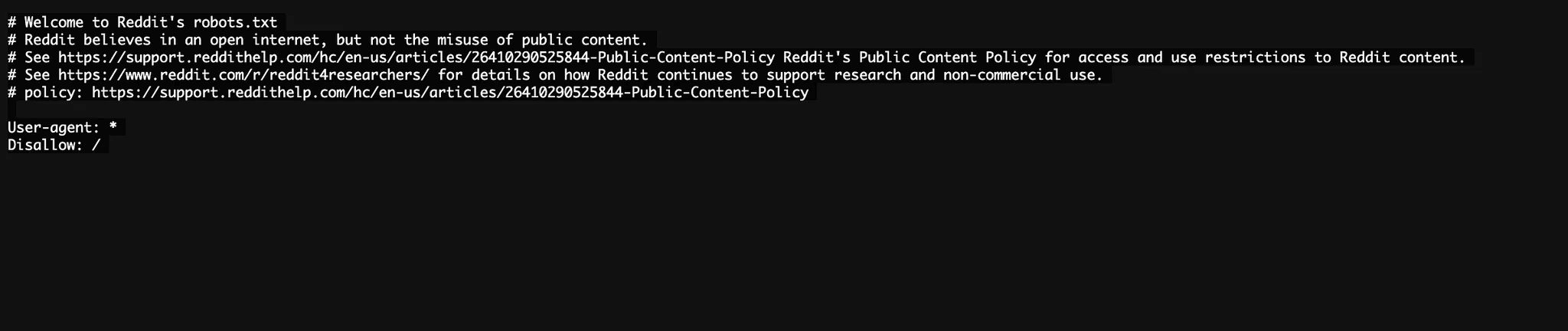 興味深い現象としては、Redditのrobots.txtは全てのユーザーエージェントをブロックしているということ。え?だったらどうして、Googleでヒットするの?