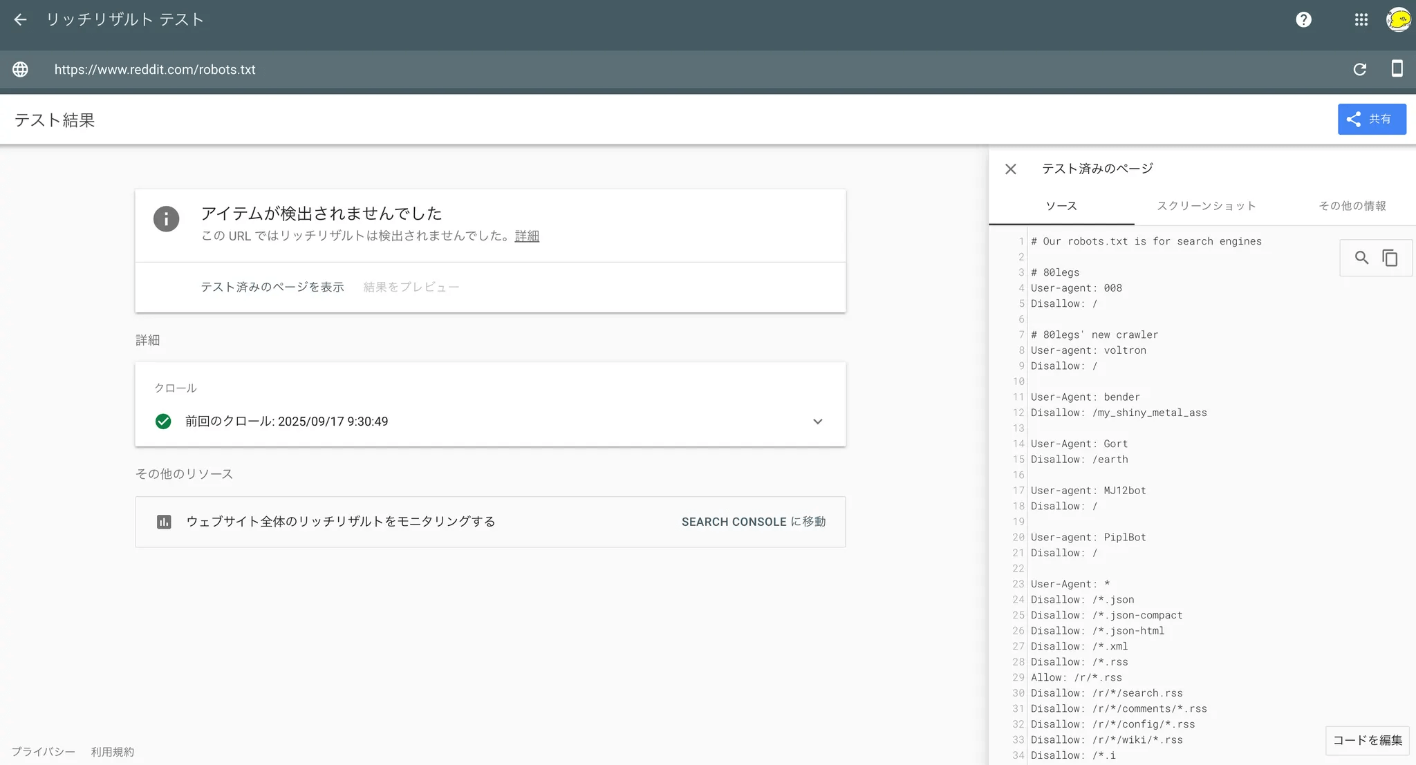 ちなみに弊社のSERPチームの確認だと、リッチリザルトテストツールでrobots.txtを確認すると異なる内容となっていました。Googlebotはdisallowされていないようですので、アライアンスによる特殊契約に基づいた合法クローキング(編注:ユーザーと検索エンジンに対し異なるコンテンツを表示すること)といった趣の事態なのかもしれません。