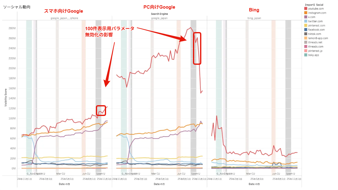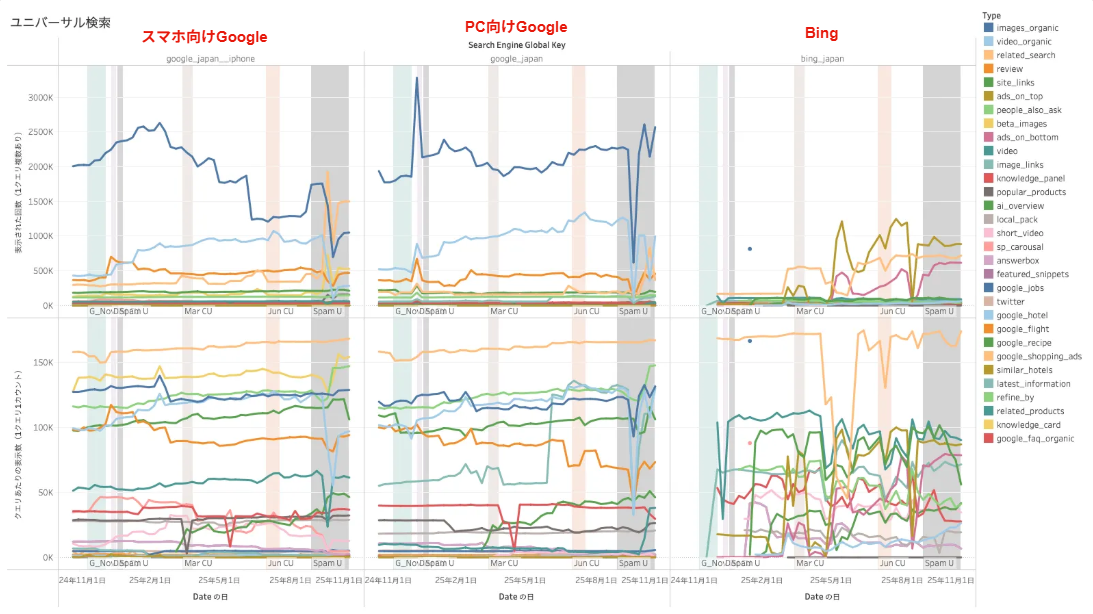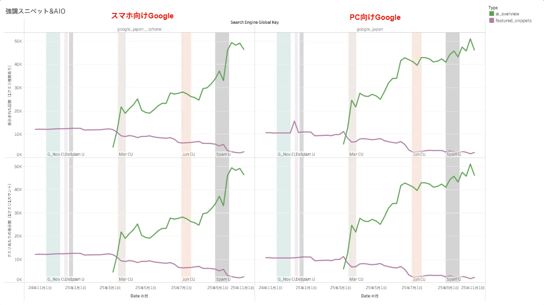 グラフの中で、色付きの帯表示の期間がGoogleによるアップデート期間を示しています。