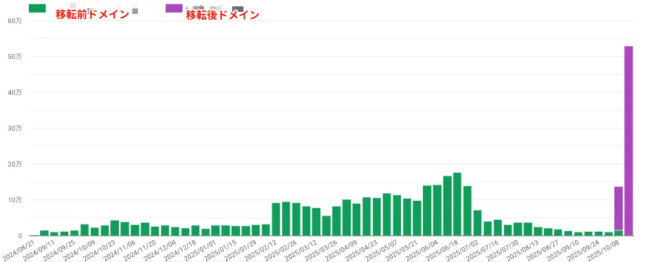某輸入医薬品販売サイトの事例。移転前ドメインが、2025年6月コア・アップデートで下落した後、別のドメインにリダイレクトすることでビジビリティが大幅に上昇した事例(緑から紫に)。