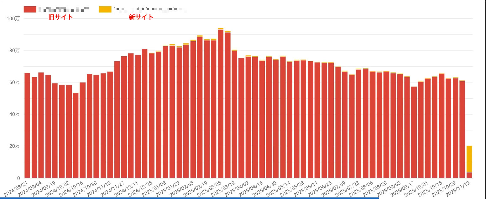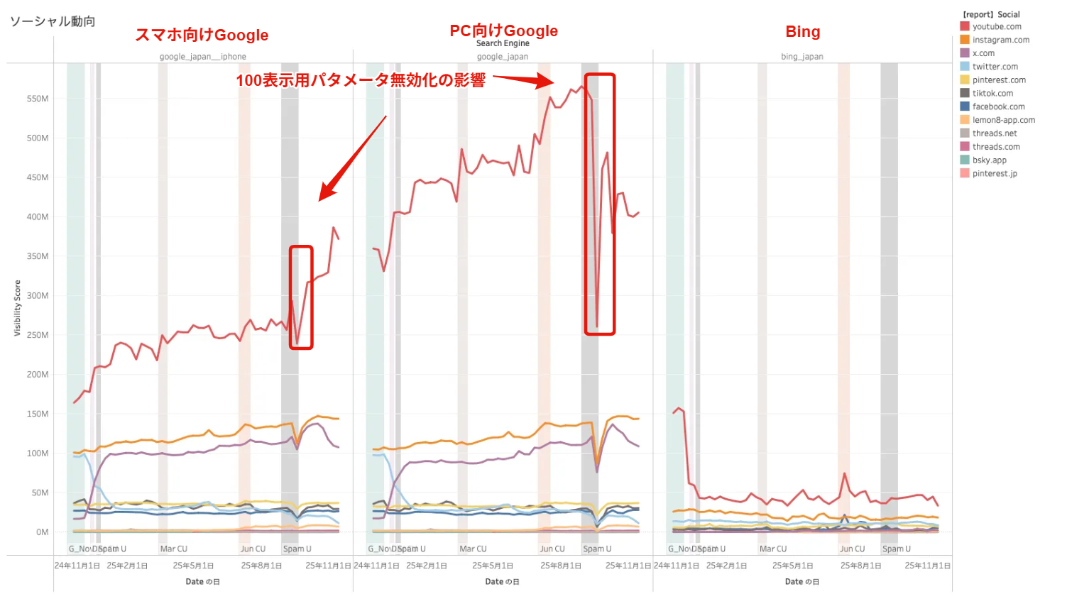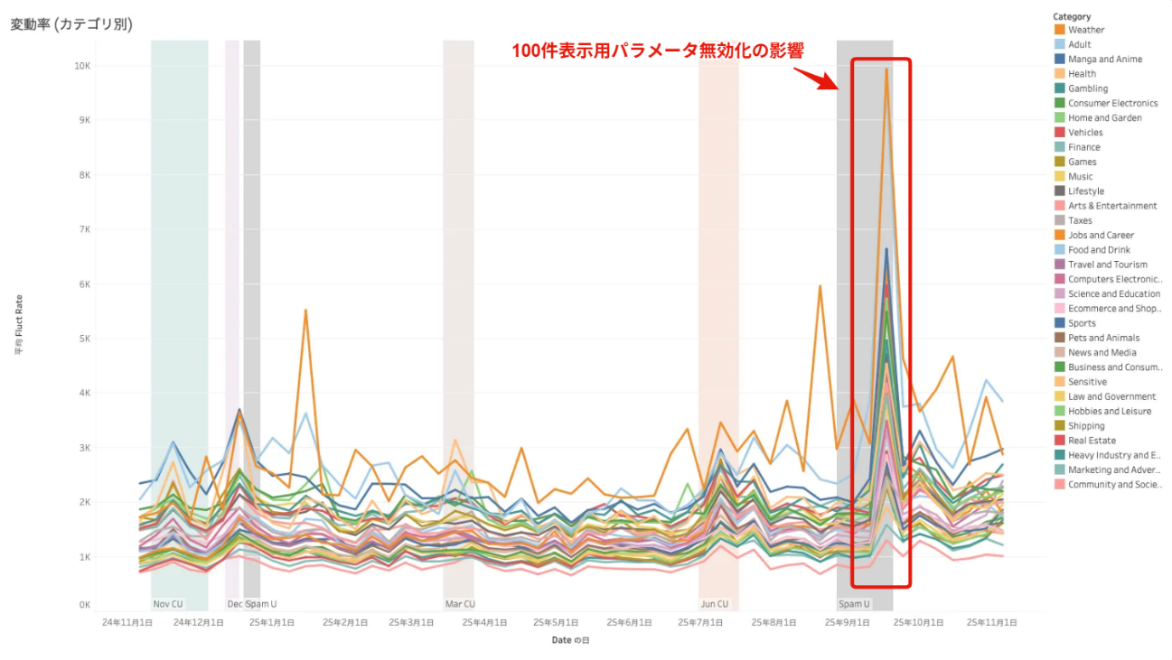 直近の大きな変動は、先月ご報告した例のGoogle検索100件表示パラメータ無効化の影響です(弊社ツールでは仕様変更対応済)。10月から11月にかけては、やや変動のベースが高めではありますが、波形そのものは安定傾向です。