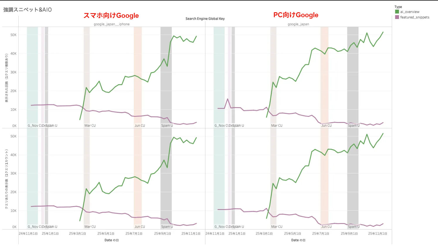 9月頃に一気に伸びたスマホ版GoogleでのAIO表示ですが、ほぼPC版と同じ動きになりましね。