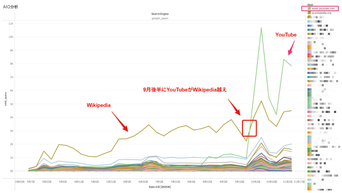 AIO関連のSERPsデータが集まる中で色々と傾向分析をしております。直近の興味深い事象として、AIOにおいてはWikipediaよりもYouTubeのほうが引用ソースとして利用されているケースが多いという事実です。