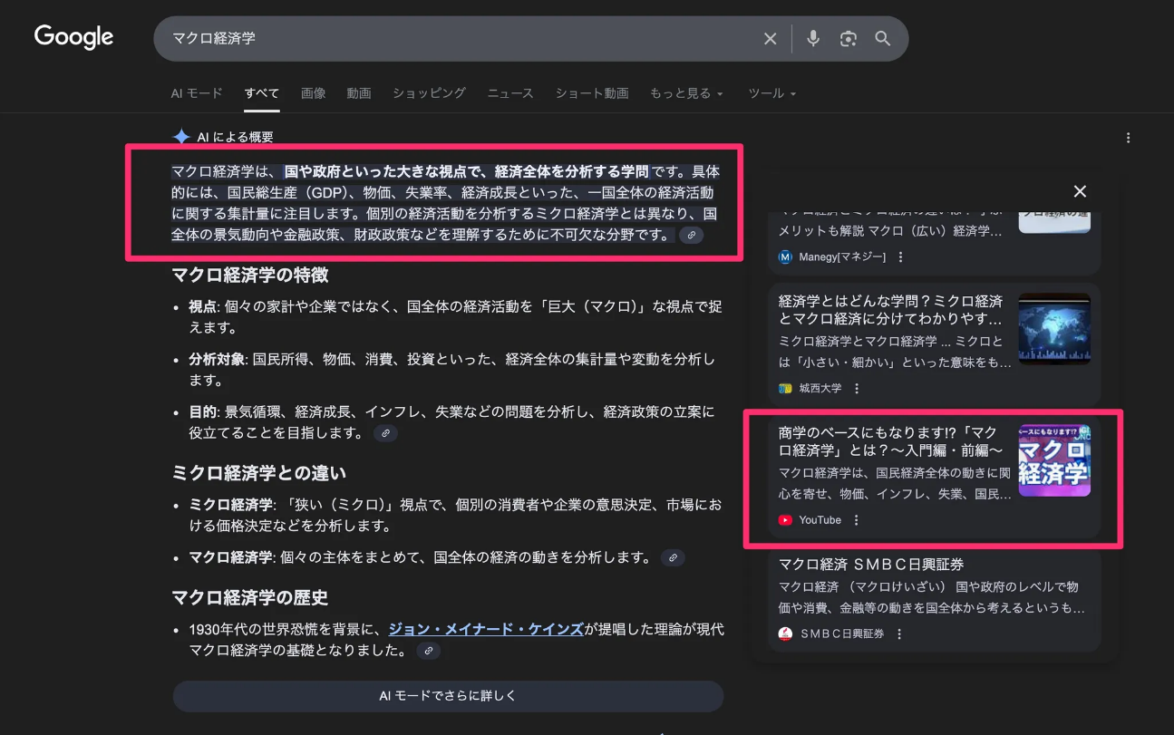 [マクロ経済学]という検索クエリで表示されるAIOが以下。titleにマクロ経済学というキーワードを含まないYouTubeの動画がヒットしています。