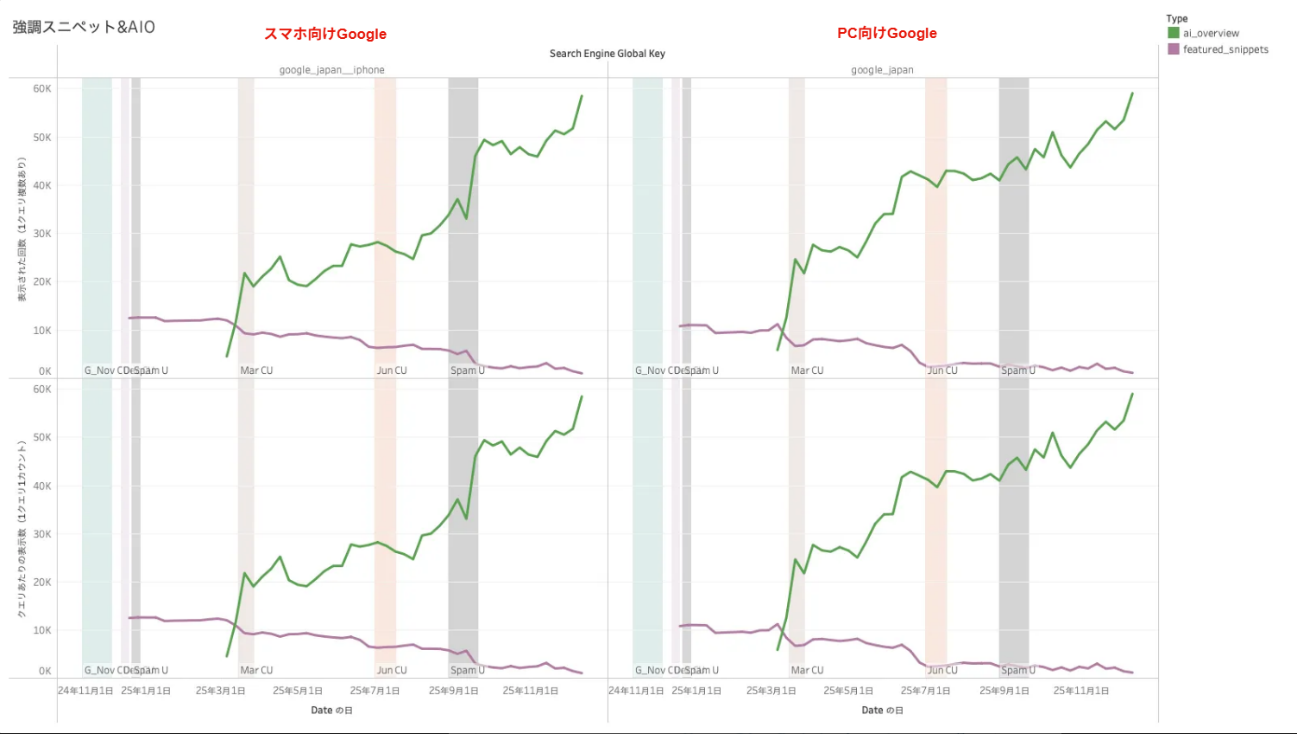 AIOが表出しはじめた2025年3月以前は、まだ強調スニペットが優位だったのですね。たった1年ですが、様変わりしました。