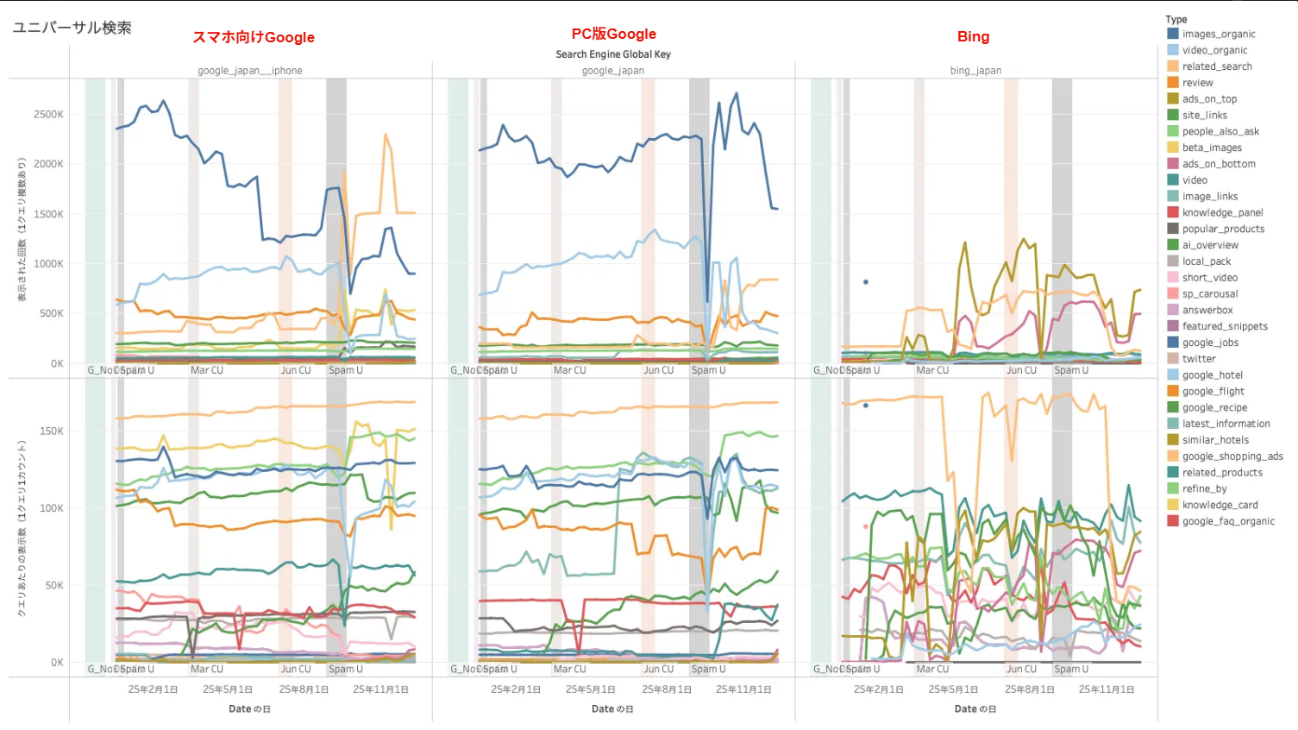 画像検索や動画検索といったGoogle検索の各種バーチカル検索結果の差し込み状況をモニタリングしていますが、先月からは大きな変動はありません。