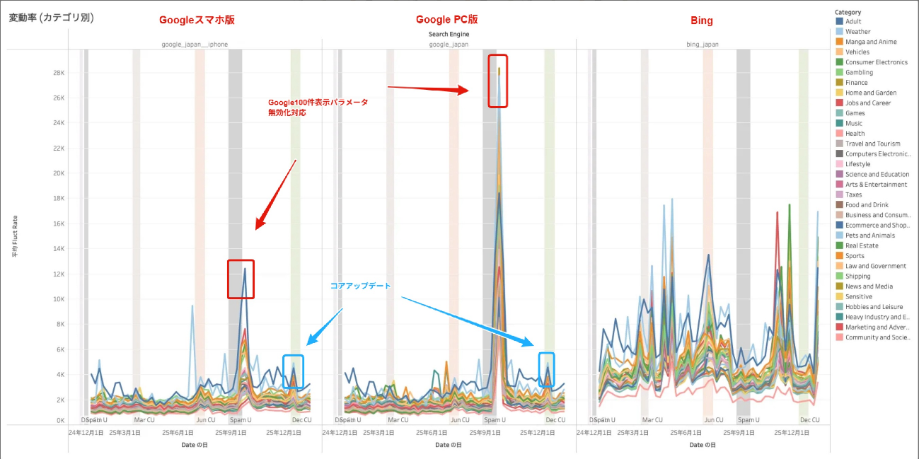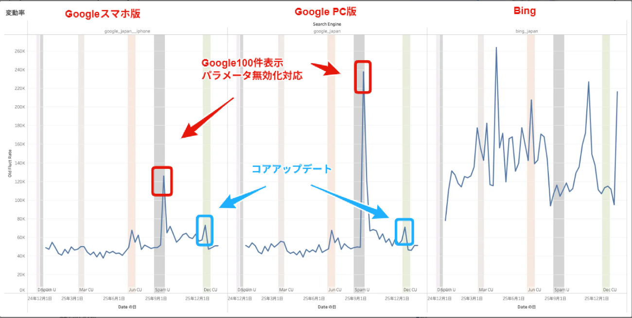 全体的な変動幅は2025年7月のコアアップデートとほぼ同程度でした。弊社(編注:JADE社)が公開した7月コア詳細レポートでは「直近1年間の中では2024年8月の次に大きな動きとなっている」とコメントしており、その意味では中程度の変動レベルと言えそうです。