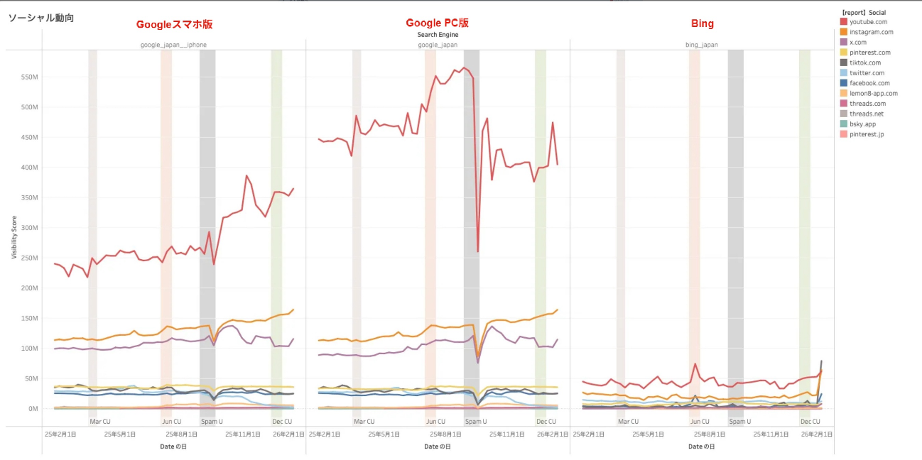 YouTubeの伸長、Instagramの継続伸長は前回から同じ傾向です。InstagramとXのビジビリティの差がジワリと広がっています。