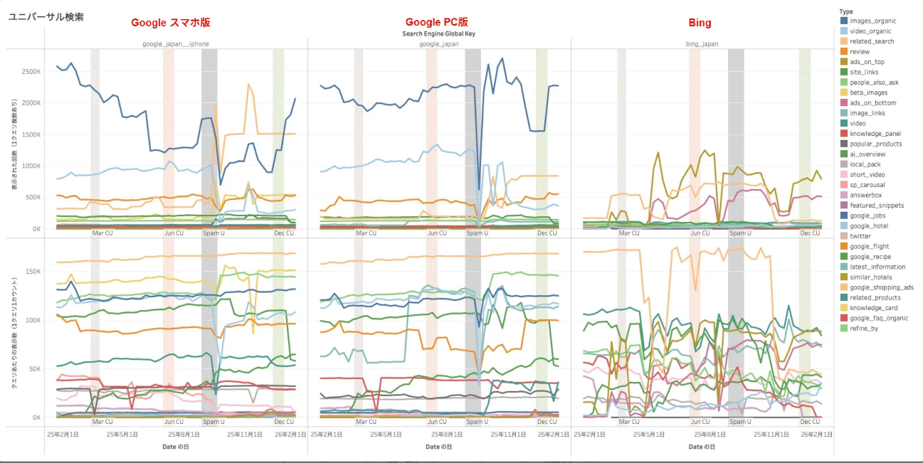 グラフが少し凸凹しており、バーチカルの挿入要素は検索結果での出し入れがかなり激しい傾向が続いています。SERPフィーチャーのテストも恒常的に動いていますので、このあたりはなかなか安定しないのかもしれませんね。
