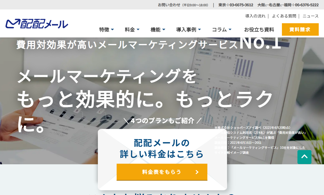配配メールは、メール配信機能のほか、効果測定やメールの改善の機能も有する、クラウド型のメール配信システムです。多くの企業がメール配信システム比較の際に検討する人気のサービスの一つです。