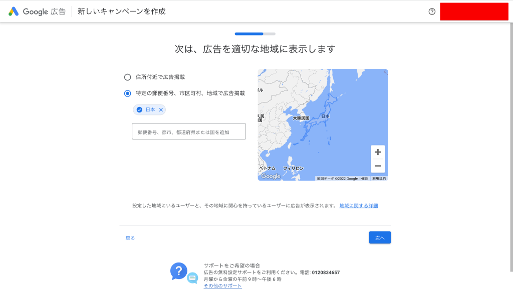 ただし、Googleキーワードプランナーを使用するだけが目的の場合は、デフォルトの日本全国の設定のままで問題ありません。地域設定を変更せずに、そのまま次のステップに進むことをおすすめします。