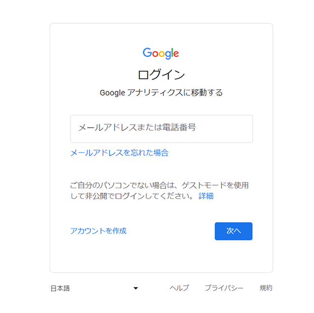・ログイン方法は、まずGoogleアナリティクスの公式サイトへアクセスし、Googleアナリティクスのアカウント情報のメールアドレスとパスワードを入力する。
