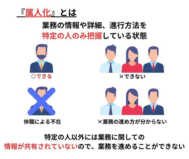 属人化とは、業務の情報を特定の人のみ把握している状態を指します。特定の人以外には業務に関しての情報が共有されていないので、不在の時には業務が進まなくなってしまうリスクがあります。
