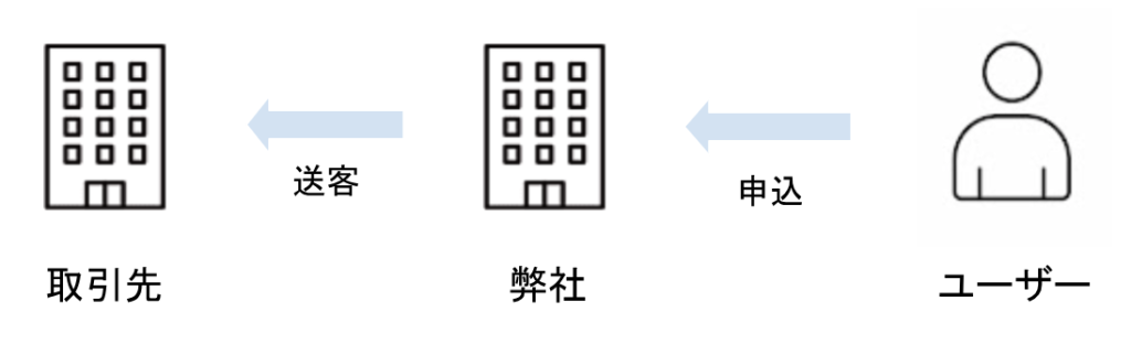 弊社のビジネスモデルは基本的に全てBtoBtoCのビジネスモデルです。弊社のサービスにて申し込みが行われた後、取引先に送客を行います。そして送客の後、取引先にて接客・クロージングを行なっていただく流れとなります。