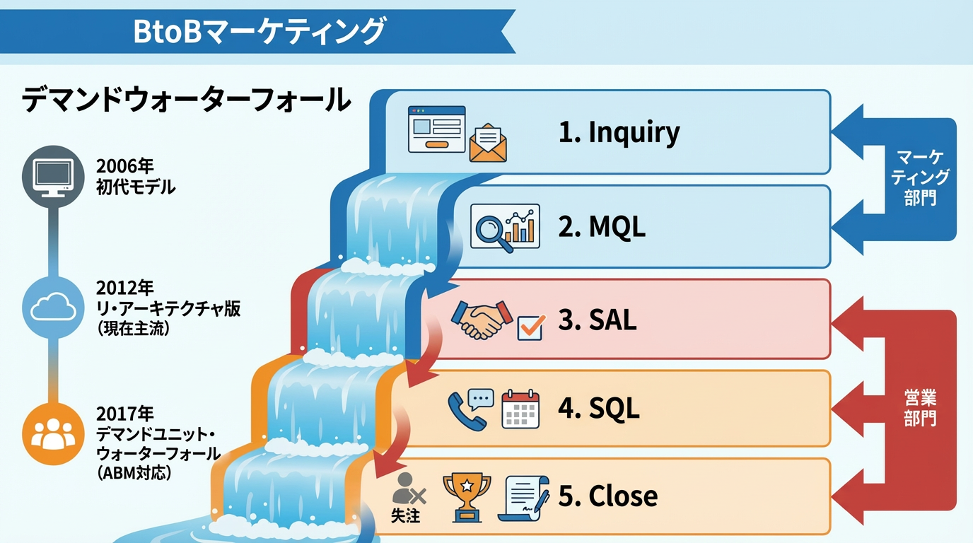 | 初代デマンドウォーターフォール | 2006年前後(2000年代半ば) | マーケティングと営業のプロセスを体系的に定義した代表的なモデル。 |