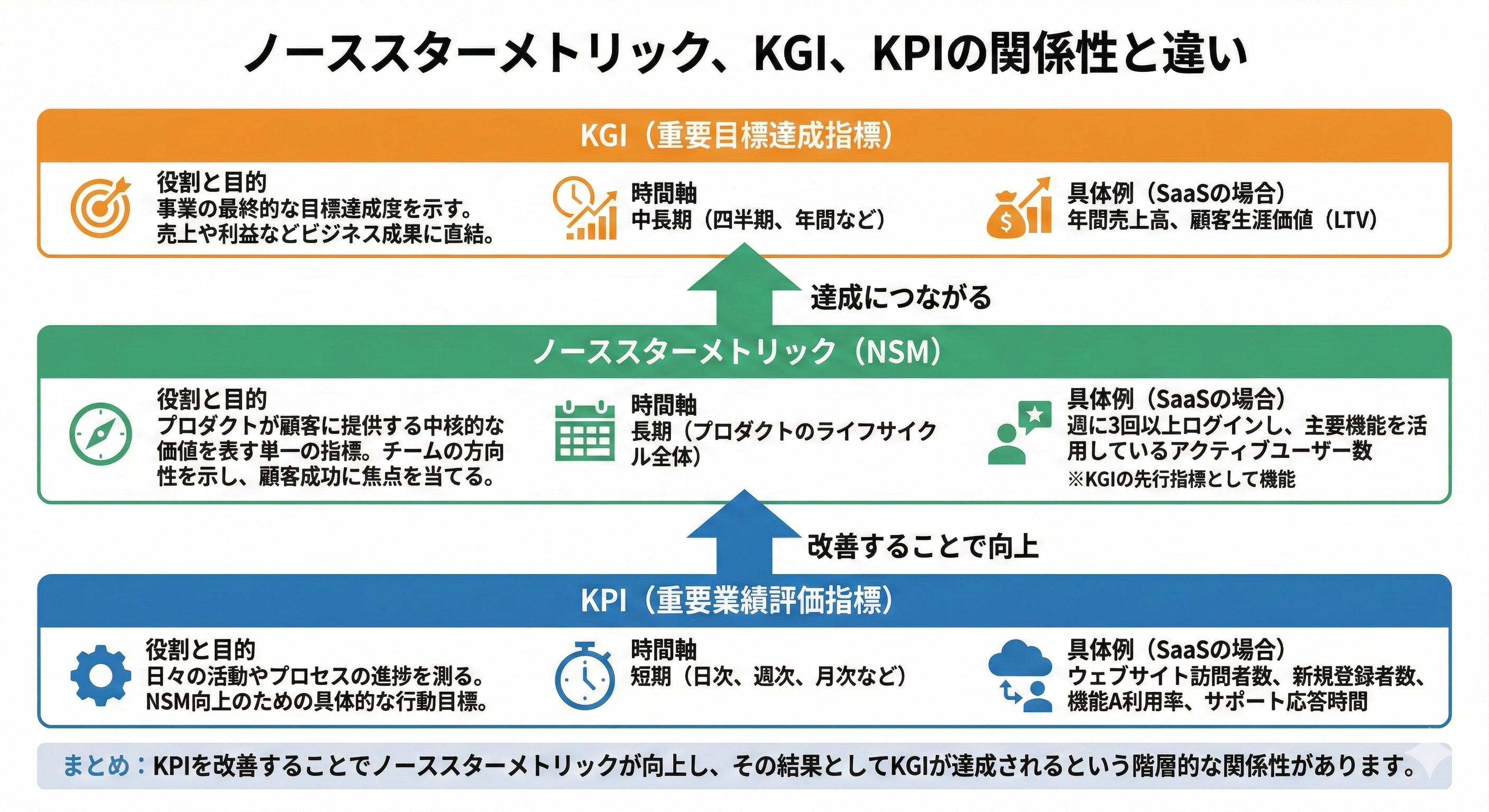 | KPI(重要業績評価指標) | KGI達成に向けた日々の活動やプロセスの進捗を測る指標。NSMを向上させるための具体的な行動目標となる。 | 短期(日次、週次、月次など) | ウェブサイトの訪問者数、新規登録者数、機能Aの利用率、カスタマーサポートの応答時間 |