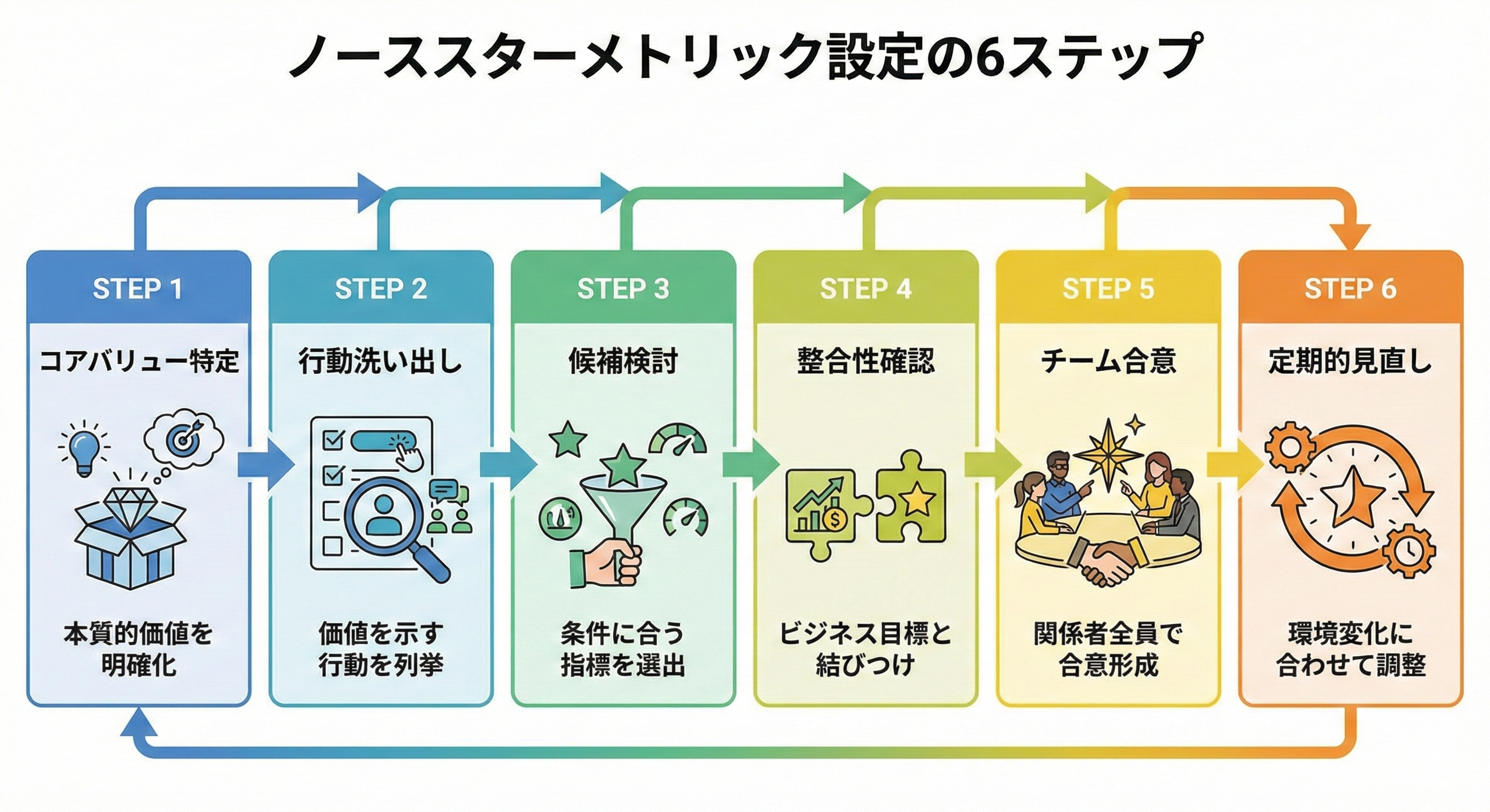 ノーススターメトリックの設定は、一度行えば終わりというものではありません。以下のステップを踏むことで、より効果的な指標を設定し、運用していくことが可能です。
