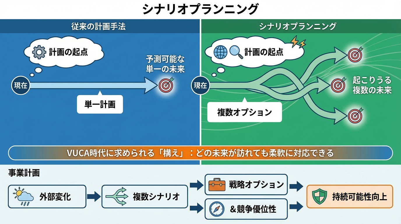シナリオプランニングは、将来を正確に「予測」するのではなく、起こりうる複数の未来を「想定」し、それぞれに備える点で、従来の計画手法とは根本的に異なります。VUCAと呼ばれる変動性、不確実性、複雑性、曖昧性が高い現代のビジネス環境において、過去のデータやトレンドの延長線上で未来を描く単線的な計画だけでは、予期せぬ変化に対応しきれない場面が増えています。 シナリオプランニングは、どの未来が訪れても柔軟に対応できる「構え」を作っておくための思考法なのです。