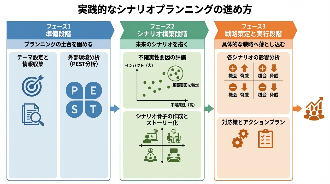 この章では、シナリオプランニングを実際にどのように進めていくのか、その具体的な手順を3つのフェーズに分けて詳しく解説していきます。それぞれのフェーズで何をすべきかを正しく理解し、自社の事業計画やマーケティング戦略の策定に活かしていきましょう。