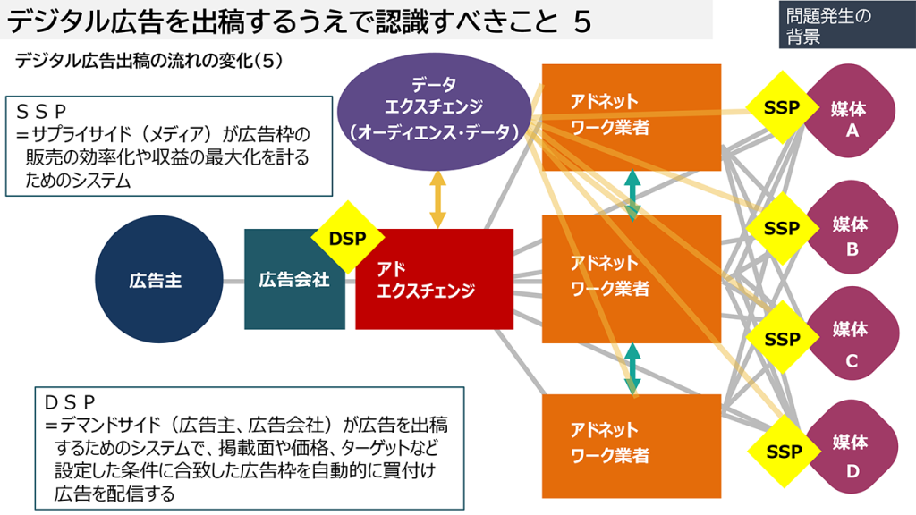 1.DPFが形成するデジタル広告配信ネットワークの拡大と並行して、その広告取引所としての透明性や支配性が問題視されている。単価の問題においては広告販売低単価(メディアが個別販売する単価に比べ)による相対的なメディア価値の下落が長らく危惧されている。