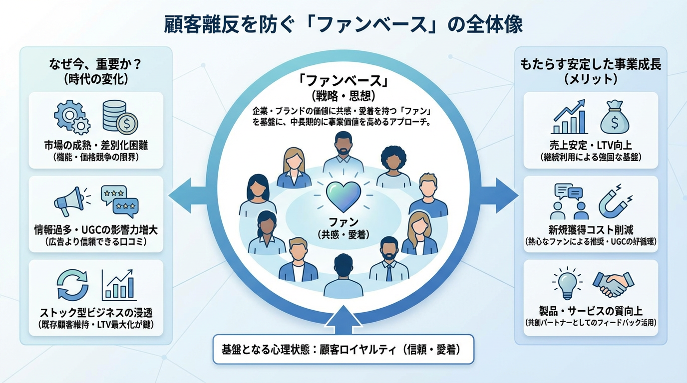 そして第三に、サブスクリプションモデルに代表されるストック型ビジネスの浸透です。新規顧客の獲得コスト(CAC)をかけても、すぐに解約されてしまっては収益につながりません。既存顧客との関係を維持・深化させ、LTV(顧客生涯価値)を最大化することの重要性が、かつてなく高まっています。 これらすべての課題に対する有効な答えが、ファンベースという考え方なのです。