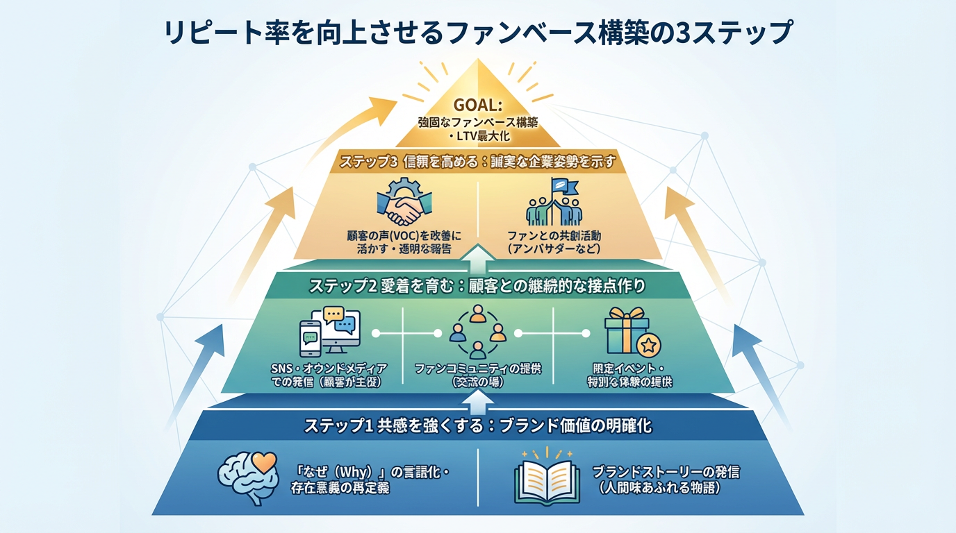 顧客が自社のファンとなり、継続的にサービスを利用してくれる状態は、一朝一夕には生まれません。しかし、正しい手順を踏むことで、着実に顧客との絆を深めることが可能です。この章では、顧客の離反を防ぎ、LTV(顧客生涯価値)を最大化するための「ファンベース」構築の具体的な3ステップについて、企業のマーケターが明日から実践できる形で詳しく解説していきます。