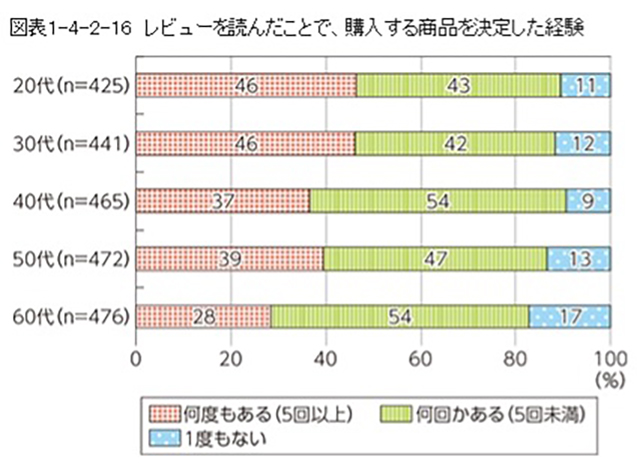 総務省の調査によると、20代から60代の幅広い年齢層において、口コミやレビューを読んだ結果、購入を決定した経験のある人が80%にも上ることが明らかになっています。この統計からも、口コミが消費者にとって「真の情報源」として高く評価され、購買決定プロセスに大きな影響を与えていることが分かります。