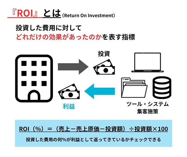 ROIとは、投資した費用に対してどれだけの効果があったのかを表す指標のことを指します。日本語では「投資収益率」とも呼ばれます。企業が行う事業や施策において、どの程度の効果があったのかを把握することは非常に重要となります。その際にROIを活用して効果を確認、検証します。この指標が高いほど「投資効率が高い」と判断でき、成功しているととらえることができます。