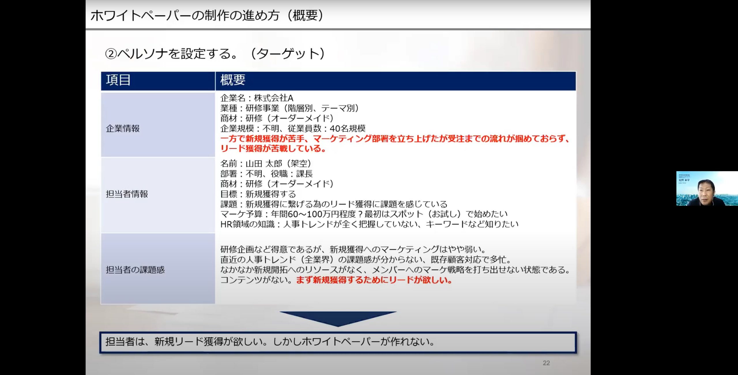 例えば「企業情報」の項目には、業種・商材・企業規模のほか、企業としての課題を書き込み、さらに「担当者の課題感」の項目にも、「なかなか新規開拓へのリソースがなく、メンバーへのマーケ戦略を打ち出せない状態である。コンテンツがない。まずは新規獲得するためにリードが欲しい」とより具体的な課題感を書き込んで、それをもとに「担当者は、新規リード獲得が欲しい。しかしホワイトペーパーが作れない」といったペルソナを設定していきます。