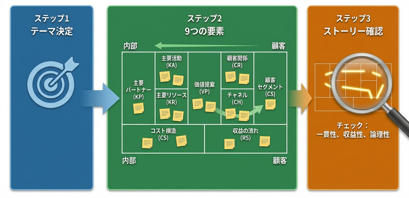 この章では、ビジネスモデルキャンバスを実際に作成するための、シンプルで分かりやすい3つのステップを解説していきます。フレームワークと聞くと難しく感じるかもしれませんが、手順に沿って進めることで、誰でも事業の設計図を描き出すことが可能です。特に、自社のBtoB事業やSaaSプロダクトの現状把握、そして今後の戦略立案に、必ず役立つはずです。