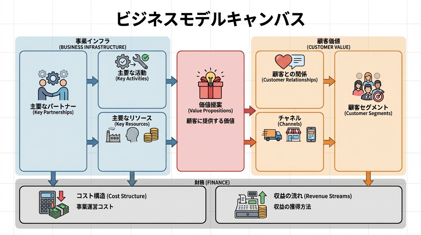 ビジネスモデルキャンバスとは、事業がどのように利益を生み出すかの仕組み(ビジネスモデル)を、一枚のシートに可視化するための共通言語です。 スイスの経営学者であるアレックス・オスターワルダー氏らによって提唱されたこのフレームワークは、事業を「顧客セグメント」や「価値提案」といった9つの要素に分解し、それぞれの関係性を直感的に理解できるよう設計されています。 これにより、新規事業の立案や既存事業の分析・改善を行う際に、複雑に絡み合う要素を整理し、チーム全体で事業の全体像を俯瞰的に捉えることが可能になります。