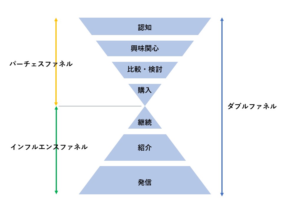 前出のパーチェスファネルとインフルエンスファネルを文字どおり「ダブル」で組み合わせることで、マーケティング効果の最大化を図ることを目指すのが、ダブルファネルだ。インターネットショッピングサイト上のレビューや、ソーシャルメディアに投稿された話題の口コミなど、消費者のさまざまな「声」が可視化された現代において、インターネット上の評判を検討材料とし、また自らもサービスや商品の購入後にSNS上で発信したり、知人や友人に勧めたりすることで、商品・サービスの認知度を向上させ、より多くの他者への認知や関心を創出していくという考え方が広まりつつある。