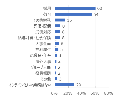 「コロナ禍を機にオンライン化した業務」においても「採用」が最多の60%との回答、次が「教育」の54%であったことから、企業の人事関連業務では、採用と研修などが最も影響を受け、変革が起きている業務であることが分かる。